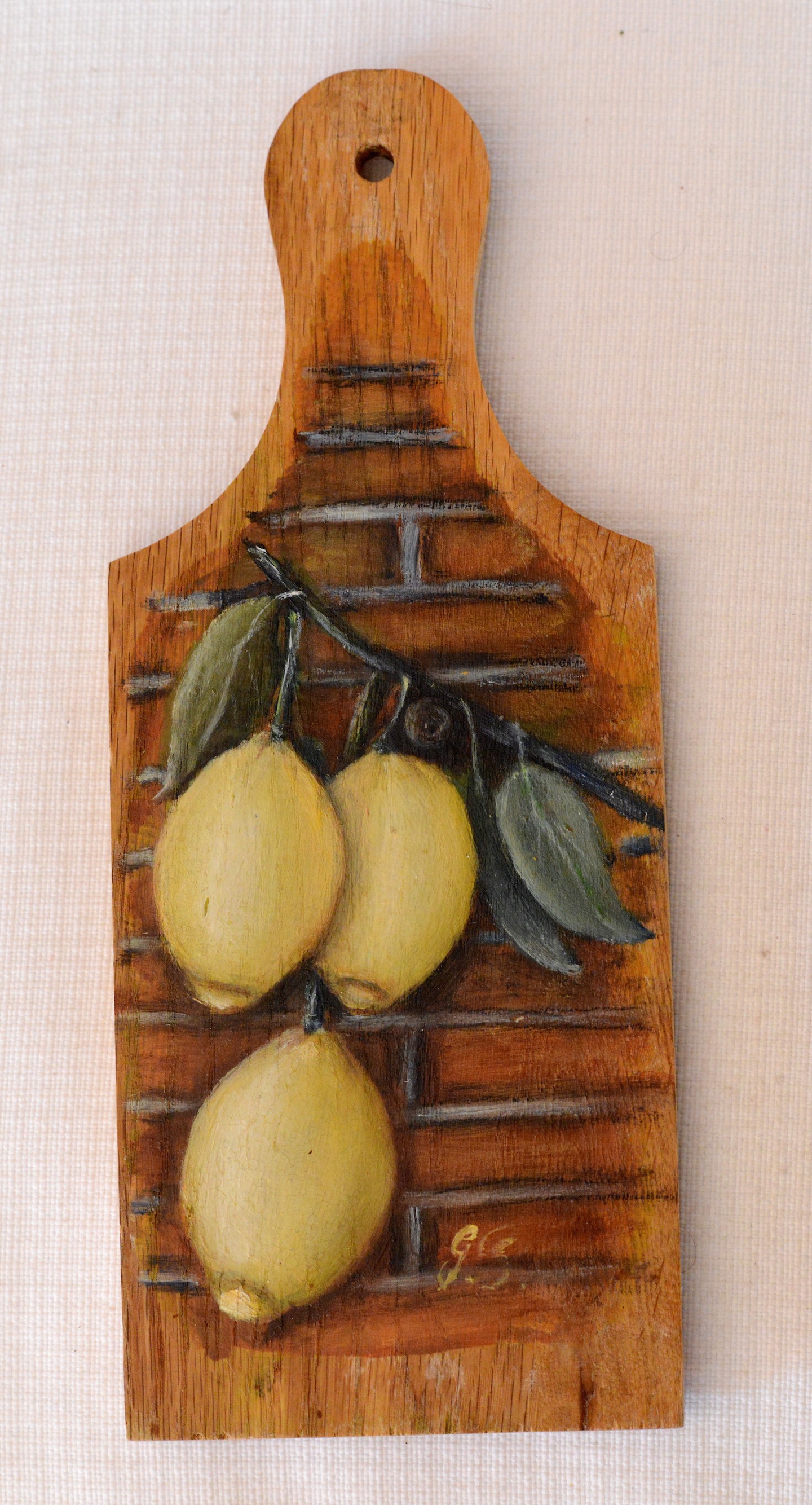 Tagliere con limoni - Olio su legno, 12x30 cm, anno 2002