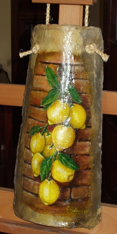 Tegola siciliana con limoni - Olio su tegola siciliana, 30x50 cm, anno 2003